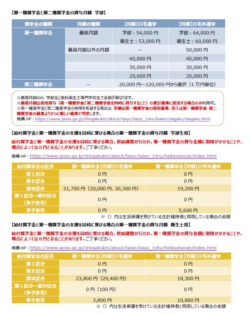 通学形態(自宅・自宅外)別に定められた金額から選択可能です。第一種奨学金の最高月額は生計維持者の収入によっては選択できないこともあります。